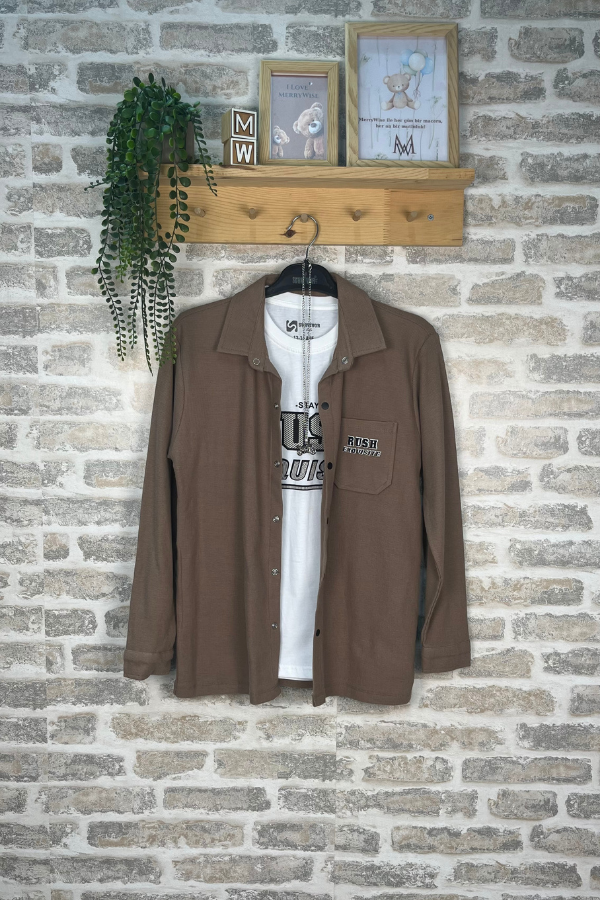 13-16 Yaş Erkek Çocuk Kahverengi Oversize Gömlek Ceket Tişörtlü Takım