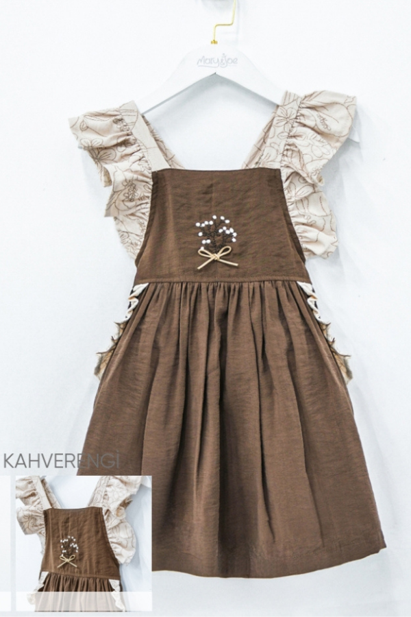 2-5 Yaş Kız Çocuk Elbisesi Fırfırlı Askılı Kahverengi Şık Elbise