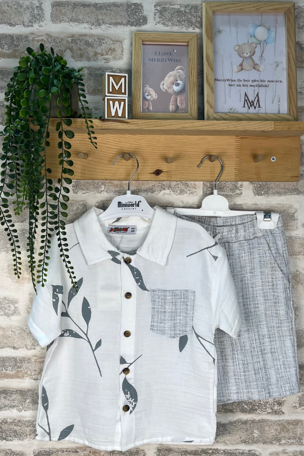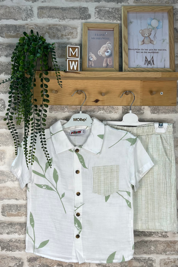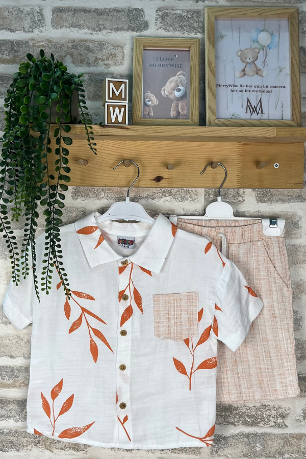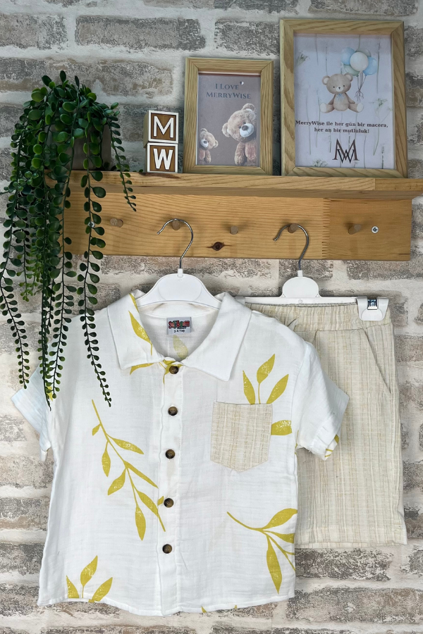 3-10 Yaş Erkek Çocuk Gömlek Şort Takım – Yaprak Desenli Yazlık Pamuklu Takım