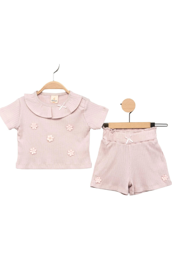 Üst parçada yer alan çiçek detayları ve şık yaka tasarımıyla dikkat çeken bu kız takım, uyumlu şortu ile kombinlenerek estetik bir görünüm oluşturur. Günlük kullanımda veya özel anlarda tercih edilebilecek bu kız bebek takım, zarif görünümüyle fark yaratır.