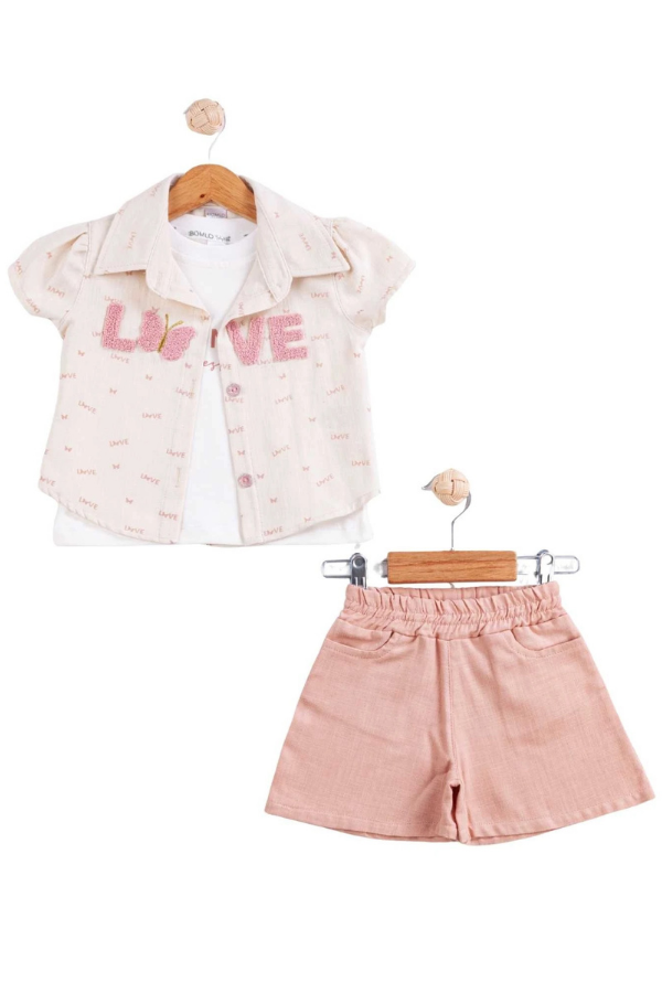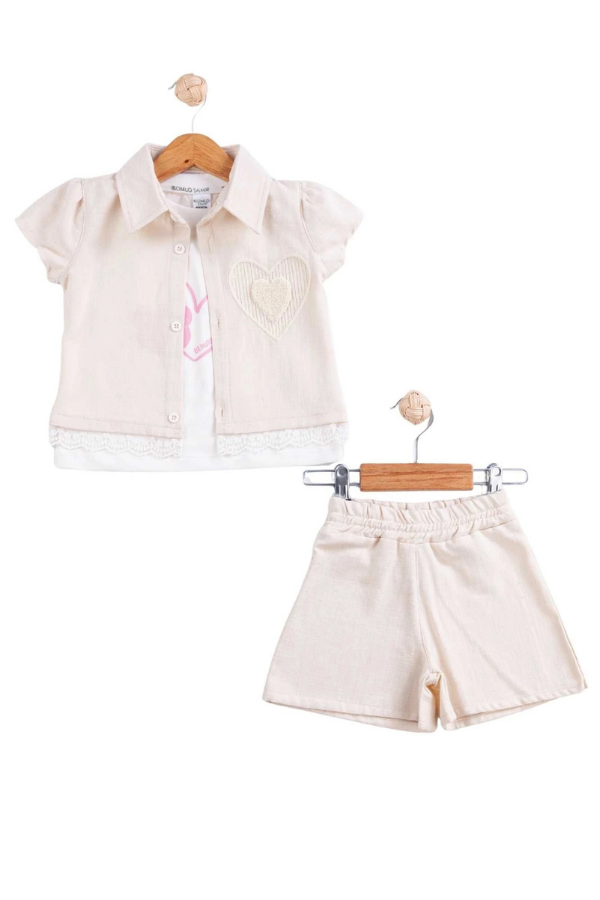 Sevimli detayları ve zarif tasarımıyla öne çıkan bu özel tasarım kız çocuk takımı, 6-24 ay arası bebekler için şıklık ve konforu bir arada sunar. Gömlek, şort ve iç parçadan oluşan bu kız çocuk takımı, kalp nakış ve yazı detaylarıyla estetik bir görünüm kazandırır.