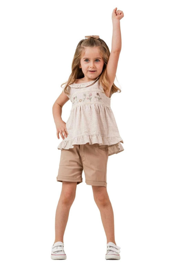 Doğal tasarımı ve zarif detaylarıyla öne çıkan bu özel tasarım kız çocuk takımı, 6-9 yaş arası çocuklar için şıklık ve konforu bir arada sunar. Nakış detaylı üst parçası ve uyumlu şortu ile kombinlenen bu kız çocuk takımı, sade ve estetik görünümüyle dikkat çeker.