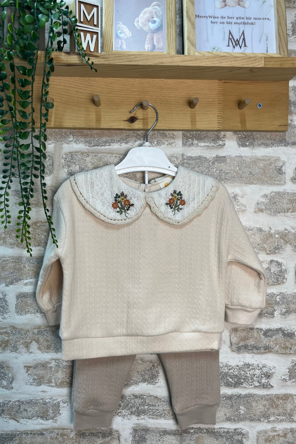 Çiçek Nakışlı Bebek Takımı - Ekru Bebe Yaka Üst ve Bordo Pantolon Kombini