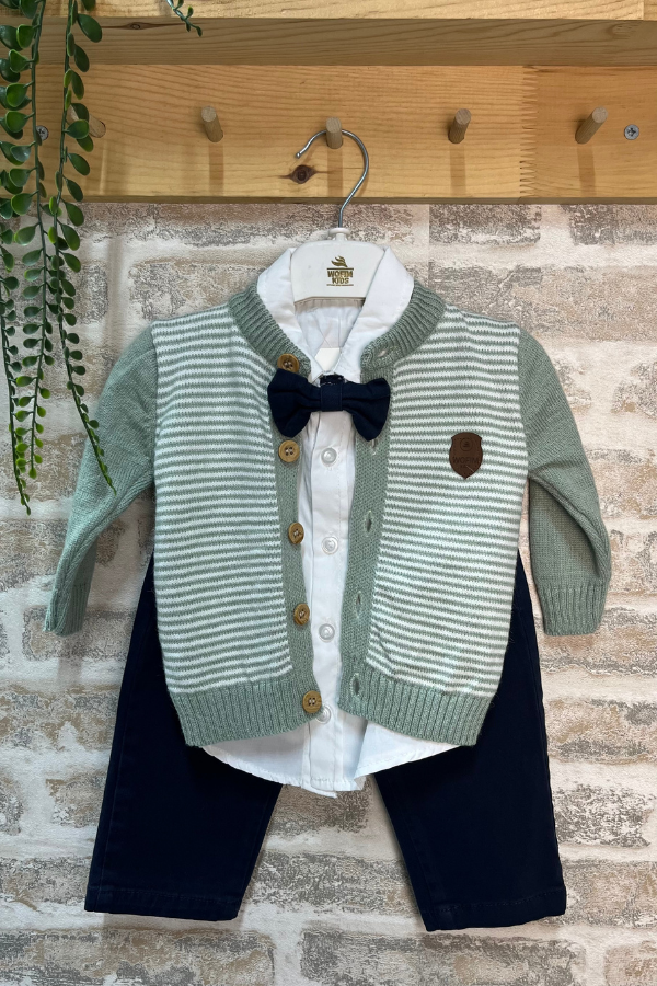 İki farklı renk seçeneği bulunan erkek bebek takım, bej ve yeşil hırka alternatifleri ile farklı tarzlara hitap eder. Fotoğraf çekimleri, doğum günleri ve özel davetler için oldukça şık bir görünüm sunan erkek bebek takım, aynı zamanda günlük kombinlerde de rahatlıkla kullanılabilir.