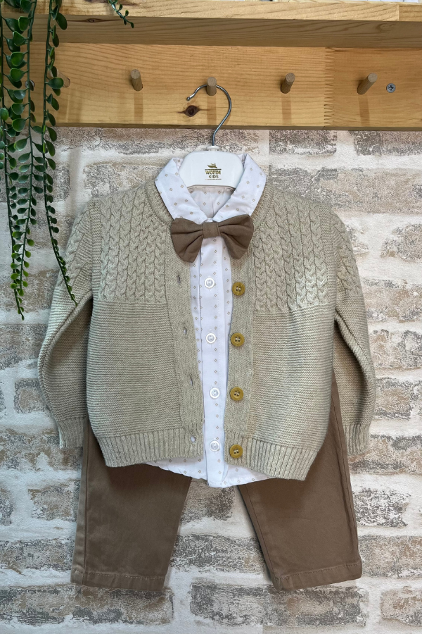 Erkek Bebek Takım 9-24 Ay Triko Hırkalı Papyonlu Şık Bebek Kombini