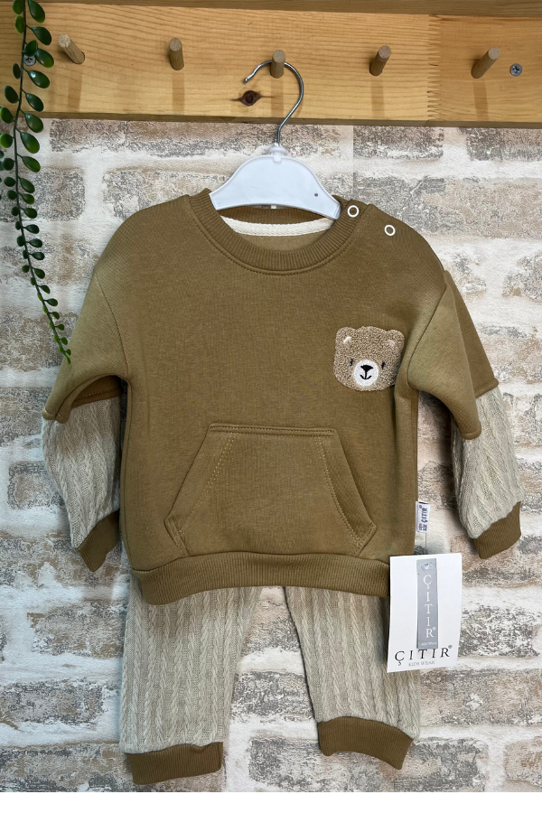 6 ay ile 24 ay arası erkek bebekler için tasarlanan bu erkek bebek takımı, sevimli ayıcık arma detayı ve doğal kahve tonlarıyla sıcak bir stil sunar. Üst kısmı cepli ve rahat kesimli olup alt parça esnek yapısıyla gün boyu konfor sağlar.