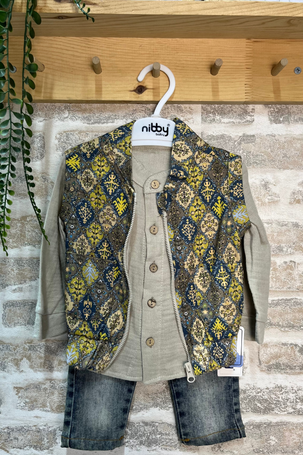 9 ay ile 24 ay arası erkek bebekler için tasarlanan bu erkek bebek takımı, yelekli tasarımı ve özgün desenleriyle dikkat çeker. Gömlek, fermuarlı yelek ve pantolondan oluşan kombin, hem şık hem de rahat bir kullanım sunar. Yumuşak dokulu kumaşı sayesinde bebeğinizin hassas cildiyle uyumludur ve gün boyu konfor sağlar.